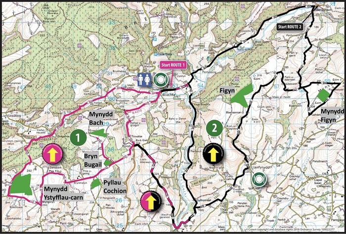 Set off along the B4310 from Abergorlech to the Forest Arms in Brechfa and pick up the pink Route 1 there. Go as far at the Horeb Cross roads where the route joins the B4310. At this point cross straight over the B4310 and follow the pink and black arrows, initially up hill, then dropping right down to the Cothi in Pontynyswen. Turn left after crossing the river on metal bridge, and after 1km turn right joining the black route at this point, and head up hill for Llanfynydd, continue as above.