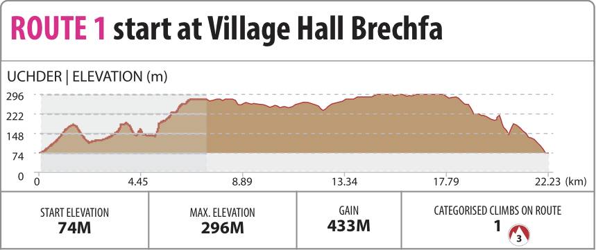 Turn left after crossing the river on metal bridge, and after 1km turn right joining the black route at this point, and head up hill for Llanfynydd. Here the serious climbing begins.