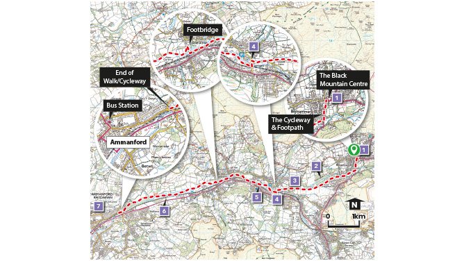 This popular route from Brynamman to Ammanford closely follows the River Amman. The route is used by walkers and cyclists, passing through woodlands, leafy lanes and parkland. The villages in the Amman Valley owe their expansion to the industrial revolution of the 19th century. Few obvious signs of this industrial age are to be found now, the spoil heaps and industrial sites have been re-landscaped and returned to woodland and farmland. There are shops, pubs and cafes in the villages along the way. Each village has heritage information panels highlighting the history and wildlife in each area.